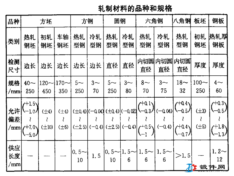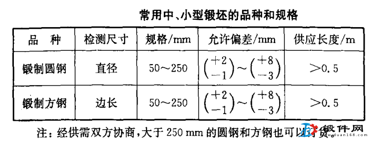 常用中、小型锻坯的品种有圆钢和方钢,其规格见表2。