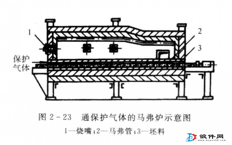 锻件在锻造加热工序中,常用的气体保护介质有惰性气体、不完全燃烧的煤气、天然气、石油液化气或分解氨等。可向电阻炉内通人保护气体,且使炉内呈正压,防止外界空气进人炉内,坯料便能实现少无氧化加热。通常是由炭化硅、刚玉等材料制成的。加热时高温炉气在马弗管外燃烧,而坯料在马弗管内与氧化性炉气 隔开.通过高温马弗管辐射传热间接加热。同时马弗管口又不断通人保持气体,从而实现了少 无氧化加热。这种方法多用于小锻件加热,不足的是,坯料出炉后,表面还会产生二次氧化。