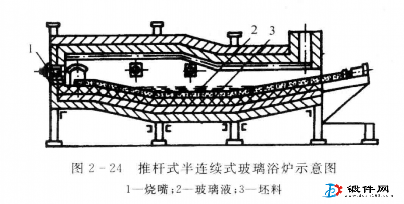 图2-24所示为推杆式半连续玻璃浴炉。炉中加热段凹形炉底内熔有高温玻璃液,锻造坯料连续推过玻璃液后便被加热,由于玻璃液的保护,加热过程中坯料不会氧化,并且,坯料推出玻璃液后,在表面附着一薄层玻璃膜,它不但能防止坯料产生二次氧化,还可在锻造时起润滑作用。这种方法加热快而均匀,防止氧化和脱碳效果好,且操作方便,是一种有前途的少无氧化 加热方法。