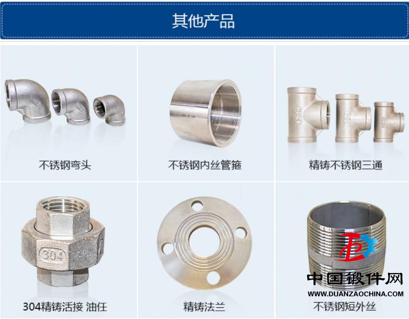 我们主要生产不锈钢和碳钢产品,如: 钢管接头、六角塞头、光面接头、六角外牙接头、水管接头、弯头、由任、三通、螺母等及其它配件,不锈钢接头、不锈钢单丝、不锈钢外丝、无缝外丝、无缝单丝、碳钢外丝、碳钢内丝、铸钢管件、水管接头、长短丝等产品专业生产加工的公司还可以根据客户的要求自行设计、生产其它类型的不锈钢制品。产品的设计与制做全部依照国际标准:API、ANSI、BS、DIN、JIS, 远销北美洲、南美洲、西欧、中东及东南亚市场。